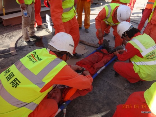 伊拉克卡爾巴拉項目部根據目前工地正逢高溫氣候季節和施工繁忙階段,針對性分別開展了受限空間作業突發事故和高溫環境下作業發生中暑的應急救援演練。