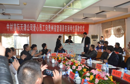 貴州省望謨縣政府還特別舉行了中材國際天津公司員工愛心助學(xué)捐款儀式。在捐款儀式中,天津公司辦公室主任劉貞華、黨群工作部長張志紅代表中材國際天津公司員工向望謨縣教育局轉(zhuǎn)交了愛心捐款18.88萬元。