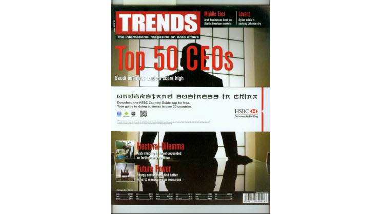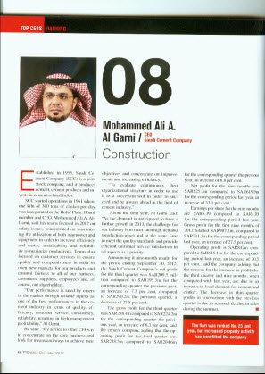 《Trends》是一本關于阿拉伯事務的國際雜志,在歐美財經界享有盛譽。2012年底《Trends》對中東區域前300強公司CEO進行評審,最終評定GARNI在工業貿易領域排名第八,在水泥行業高居榜首。“這項榮譽與SINOMA的貢獻分不開,” GARNI先生表示,“選擇SINOMA作為總承包商是我人生中最英明的決定之一。事實證明,SCC與SINOMA之間超越合作伙伴的良好關系,成就了SCC今天所取得的成就”。“SINOMA的卓越品質通過SCC項目來印證,這份雜志給我的榮譽也是給SINOMA的榮譽,讓我們共同分享——這是我給閣下最珍貴的禮物。”GARNI先生對王偉說。