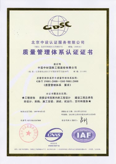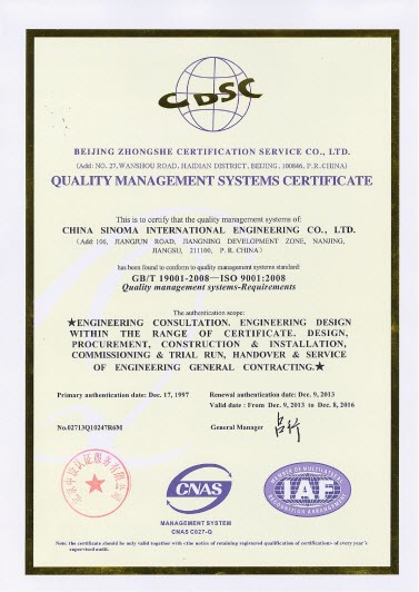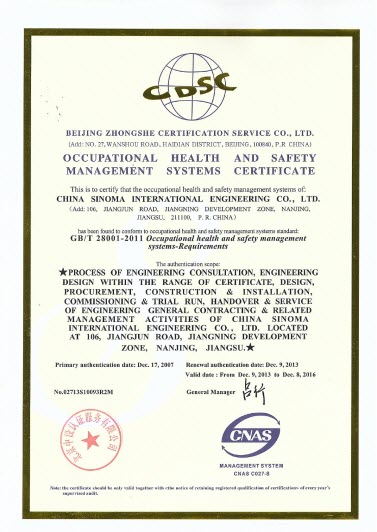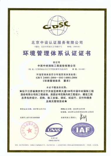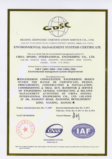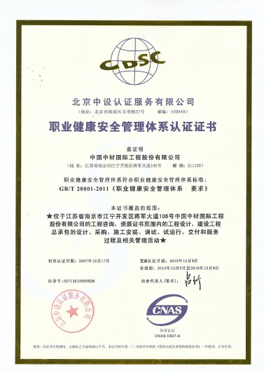 2013年,中材國際(南京)質(zhì)量、環(huán)境和職業(yè)健康安全管理體系符合GB/T 19001-2008《質(zhì)量管理體系 要求》、GB/T 24001-2004《環(huán)境管理體系 要求》和GB/T 28001-2011《職業(yè)健康安全管理體系 要求》的要求,公司的持續(xù)改進機制有效,管理體系持續(xù)有效運行。中材國際(南京)順利通過了北京中設(shè)認證服務(wù)有限公司的外部審核,近日獲得新版質(zhì)量、環(huán)境、職業(yè)健康安全管理體系認證證書。