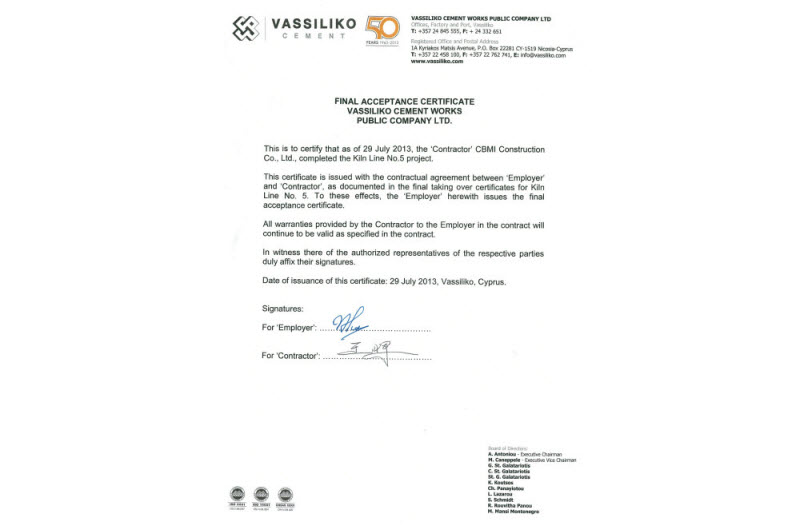12月20日,由中材國際天津公司承建的塞浦路斯項目熟料線系統獲得業主頒發的FAC證書,證書簽發日期為2013年7月29日。該項目質保期為兩年,水泥磨系統已經于2012年12月15日獲得業主頒發的FAC證書,熟料線系統FAC證書的獲得為項目的圓滿完成畫上了句號。