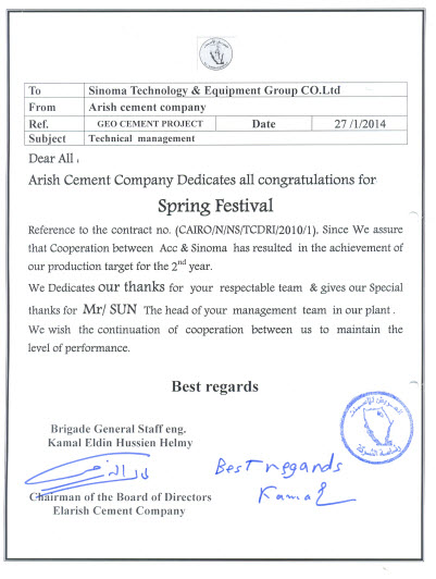 在馬年春節(jié)即將到來之際,由中材國際天津公司生產(chǎn)總包的埃及GOE項目部收到一份珍貴的春節(jié)賀禮——阿里什水泥公司董事局主席Kamal Eldin Houssien Helmy 將軍于1月27日親筆簽發(fā)的致我公司的感謝信。