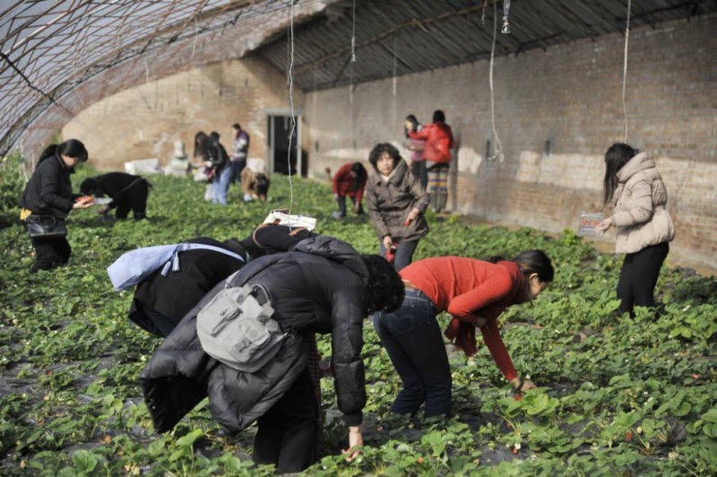 草莓的種植結構是一垅一垅的,很整齊,為了利于生長還布上了一層薄膜。細細的草莓葉莖頂上分布著一朵朵黃蕊白花,紅寶石一樣的成熟草莓和尚未成熟的綠色草莓寶寶密密地掛在草莓苗上,很是玲瓏可愛。