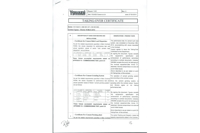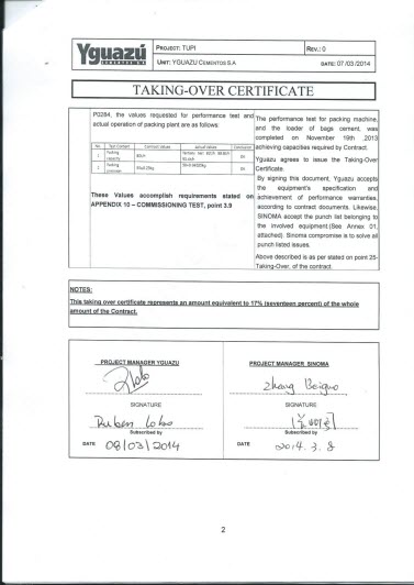 3月8日,Intercement水泥公司巴拉圭Tupi項(xiàng)目經(jīng)理Ruben Lobo先生與公司巴拉圭Tupi項(xiàng)目經(jīng)理張北國(guó)先生共同簽定了該項(xiàng)目水泥粉磨發(fā)運(yùn)系統(tǒng)接受證書,標(biāo)志著該系統(tǒng)施工、安裝、調(diào)試工作圓滿結(jié)束并正式進(jìn)入一年質(zhì)保期。得益于公司領(lǐng)導(dǎo)英明的決策、各部門各單位團(tuán)結(jié)緊密的工作、現(xiàn)場(chǎng)項(xiàng)目部科學(xué)的安排和掌控,試運(yùn)行期間,水泥粉磨系統(tǒng)各項(xiàng)參數(shù)都明顯優(yōu)于合同性能保證條款中各項(xiàng)參數(shù)界定,性能卓越,達(dá)到國(guó)際國(guó)內(nèi)同類型水泥粉磨系統(tǒng)一流水平。