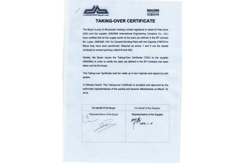 3月15日,由中材國際天津公司承建的伊拉克2*60T/H水泥粉磨站生產(chǎn)線獲得了業(yè)主簽發(fā)的臨時(shí)驗(yàn)收證書,標(biāo)志著整個(gè)項(xiàng)目順利通過業(yè)主驗(yàn)收,并全面移交業(yè)主。項(xiàng)目正式進(jìn)入一年質(zhì)保期。