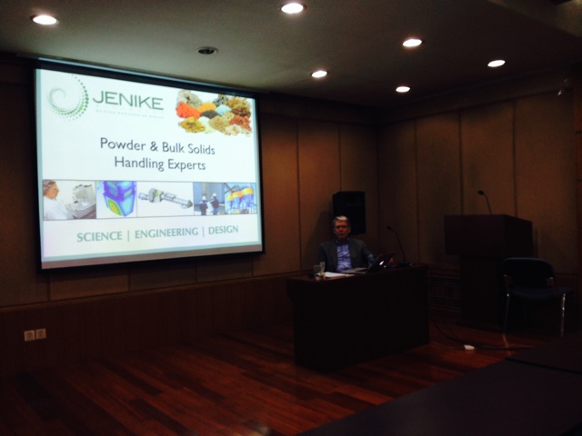交流活動(dòng)由天津公司工藝所戴恒杰主持?;顒?dòng)開(kāi)始后,天津公司總工程師俞為民首先對(duì)John先生的到來(lái)表示熱烈歡迎。隨后,John先生對(duì)JENIKE公司的歷史和其粉狀及散狀物料處理技術(shù)在工程領(lǐng)域的應(yīng)用實(shí)例進(jìn)行了簡(jiǎn)要介紹,其悠久歷史以及在全球范圍內(nèi)的影響力給大家留下深刻影響。John先生還通過(guò)簡(jiǎn)單的試驗(yàn)器皿生動(dòng)形象地演示了不同顆粒物料卸料離析和不同角度卸料下物料流動(dòng)形式的不同,結(jié)合正在合作的海德堡項(xiàng)目調(diào)配倉(cāng)以及轉(zhuǎn)運(yùn)站溜子的設(shè)計(jì),講解了該項(xiàng)目粉狀及散狀物料處理的過(guò)程。此外,John先生還詳細(xì)介紹了他們的工作流程:首先是對(duì)各種類(lèi)型原材料的取樣和收集,然后對(duì)物料的各種物性參數(shù)進(jìn)行實(shí)驗(yàn)室測(cè)試,接下來(lái)通過(guò)物理或者計(jì)算機(jī)模擬建立模型,最后通過(guò)模型指導(dǎo)設(shè)計(jì)。