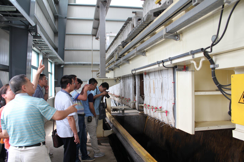 會后,孫偉、胡芝娟一行帶領大家參觀了由天津公司工程研究中心建設的桐鄉100t/d污泥深度脫水減量化示范工程項目。親眼目睹了污泥調質、壓濾、泥餅卸料等整個污泥脫水流程,尤其是泥餅的卸料過程后,大家均感到很震撼。本污泥脫水項目直接對含水率95%的濃縮污泥進行化學調理,調質后污泥經過壓濾脫水后,脫水泥餅含水率降低至50%,體積減少至原來的十分之一,成功實現污泥的減量化,藥劑成本低,經濟性顯著。