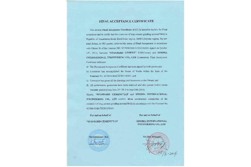 FAC證書的順利獲取,標志著哈薩克斯坦標準水泥礦渣磨項目執行工作的圓滿結束,為公司正在執行的標準水泥二線項目打下了堅實的基礎,更加鞏固了雙方一直以來良好的合作關系。