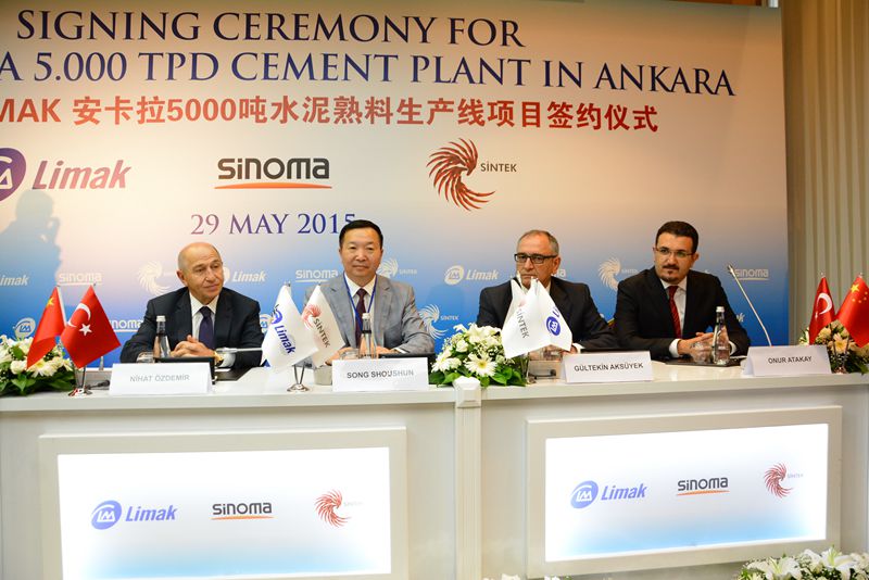 5月29日,土耳其LIMAK安卡拉5000TPD水泥熟料生產(chǎn)線簽約儀式在安卡拉正式舉行。中材國際董事長宋壽順、中國駐土耳其大使館經(jīng)商處參贊朱光耀、海外公司總經(jīng)理孟慶林、副總經(jīng)理楊蕾、市場部及土耳其項目部等相關(guān)人員以及LIMAK集團公司主席Ozdemir先生,CEO GULTEKIN AKSUYEK先生及其他董事會和高管團隊成員出席了本次簽約儀式。
