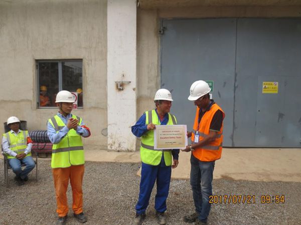 項目安全管理工作取得的成績贏得了海德堡業主的高度認可,在7月21日組織的“現場安全表彰暨水泥系統生產運行剪彩儀式”上,業主高層對CILU項目管理團隊進行了表彰。海德堡高層和CILU工廠廠長親自向項目部頒發了安全生產優秀集體榮譽證書,并給項目安全經理頒發“海德堡終身安全榮譽員工”證書。儀式上,業主和項目部領導還共同剪開寫滿全員安全承諾的彩帶。