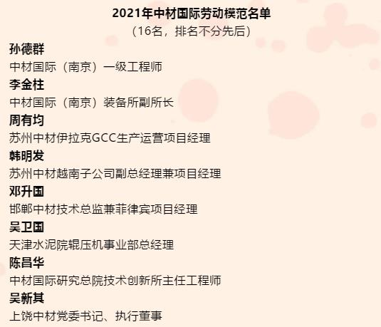 黨委副書記、總裁印志松宣讀了《關于表彰2021年中材國際勞動模范的決定》。決定指出,近年來,在中國建材集團和中國建材股份公司的堅強領導下,中材國際廣大職工深入學習貫徹習近平新時代中國特色社會主義思想和黨的十九大精神,搶抓機遇,攻堅克難,凝心聚力,開拓進取,取得了優異成績,涌現出一大批先進模范人物。經研究決定,授予孫德群等16人中材國際勞動模范榮譽稱號。