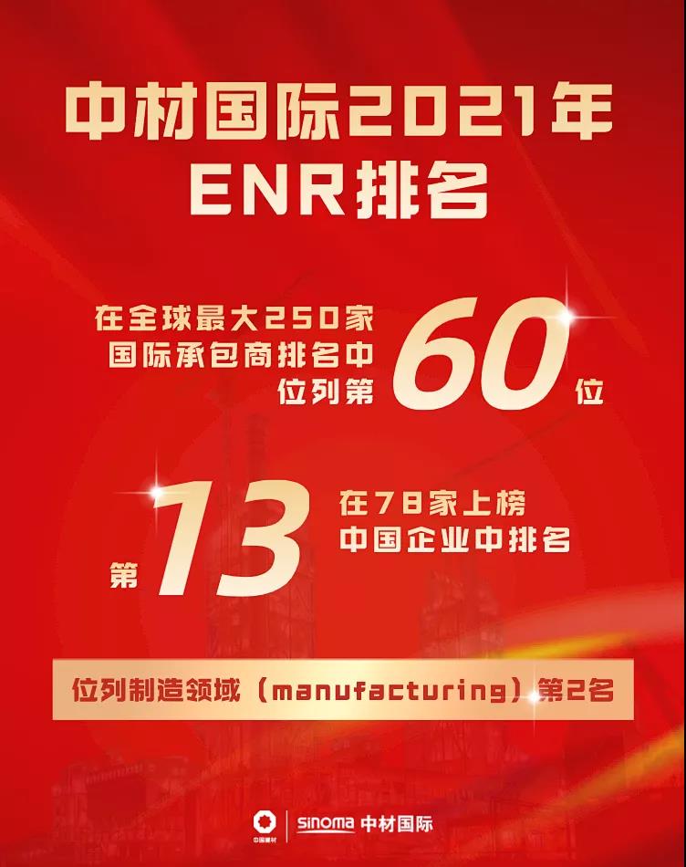 在全球最大250家國際承包商排名中,中材國際位列第60位,在78家上榜中國企業中位列第13位,在制造領域(manufacturing)十大國際承包商中排名第二。