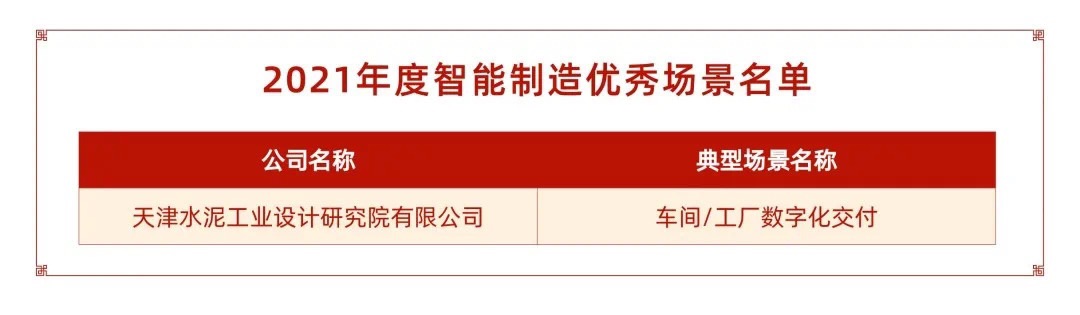 近日,國家工業和信息化部 國家發展和改革委員會 財政部 國家市場監督管理總局公布了“2021年度智能制造試點示范工廠揭榜單位和優秀場景名單”,天津水泥工業設計研究院有限公司自主研發的“車間/工廠數字化交付”上榜2021年度智能制造優秀場景名單。
